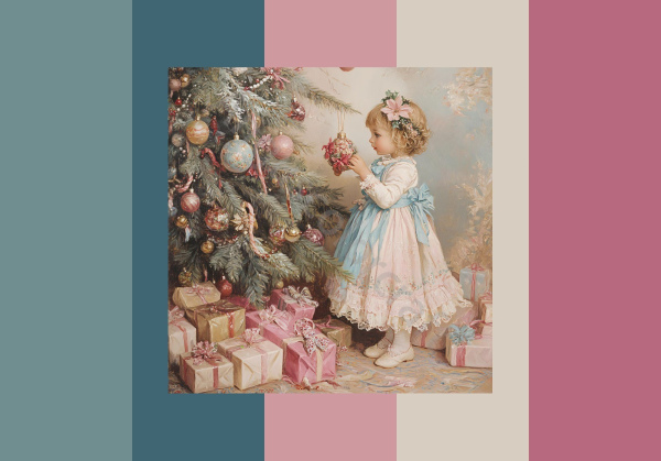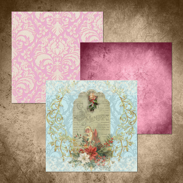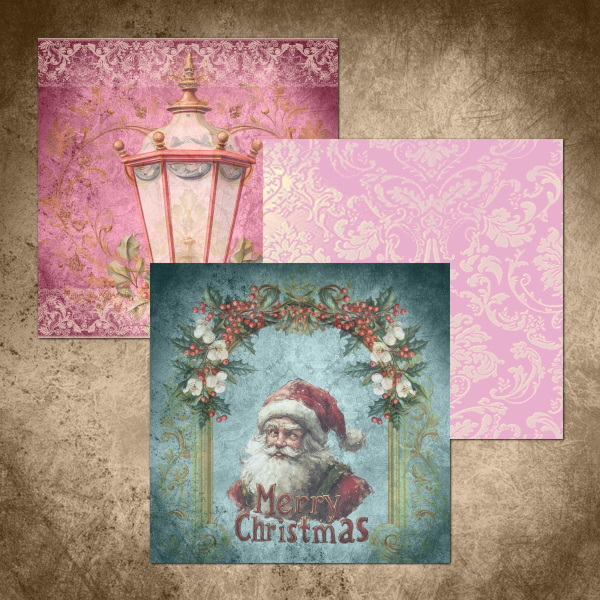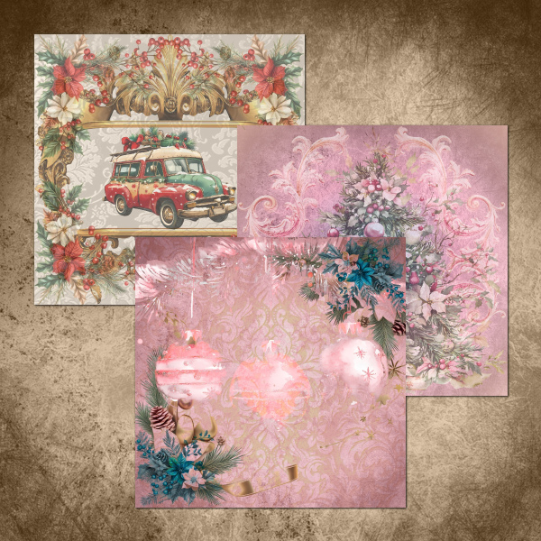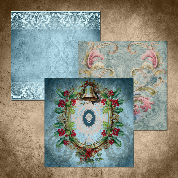 Brocade Christmas"" is a gorgeously-ornate set of 12, 12" x 12" digital original scrapbook and junk journal papers. With a combination of vintage images, shabby chic baroque ornaments and delicate hues of ivory combined with pinks and teal blues, these papers will be wonderful for any of your holiday celebrations, especially a winter wedding, baby shower, or fits a Pink or Blue Christmas celebration theme!