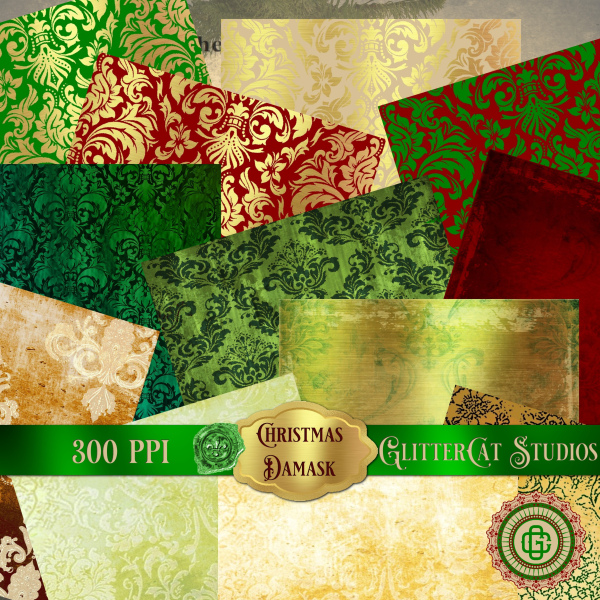 "Christmas Damask" is a gorgeously-ornate set of 12, 12" x 12" digital original scrapbook and junk journal papers. With a combination of vintage ivory combined with deep reds and bright greens in the popular Victorian damask pattern, these papers will be wonderful for any of your holiday celebrations, especially a winter wedding, baby shower, or traditional Christmas celebration heme!